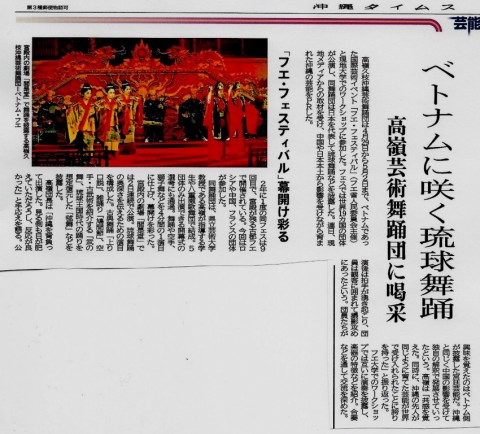ベトナム国際フェスティバルに沖縄・ベトナム友好協会が仲立ちを行い、参加いただたいた。「高嶺芸術舞踊団」のベトナム公演の記事が載りました。