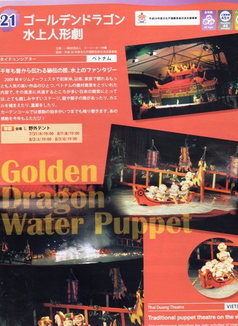 2009 年キジムナーフェスタで初来沖。以来、家族で観れるもっとも人気の高い作品のひとつ。ベトナムの農 村風景をとりいれた内容で、その風景に共通するところが多い日本の観客にとっては、とても親しみやすいステージ。龍や獅子の舞があったり、カエルを捕まえたり、農業をしたり。カーテンコールでは感動の拍手がいつまでも鳴り響きます。あの感動を今年もふたたび!