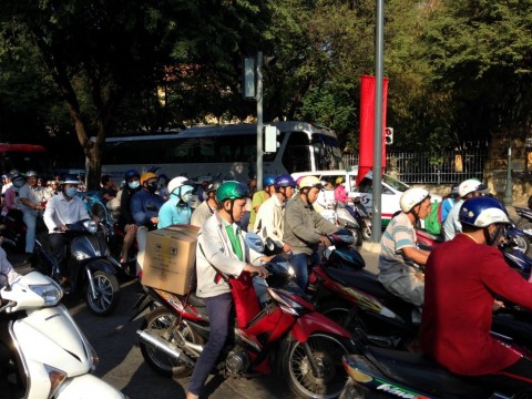 こんにちは。1月からホーチミンに来ております我謝(がじゃ)です。不定期ですが日常のベトナムを紹介させて下さい。この写真とバイクの位置がなぜこんなにバイクが近いかと言いますとバイクが歩道で信号待ちしてるのです。ホーチミンは歩道もバイクで賑わっています。