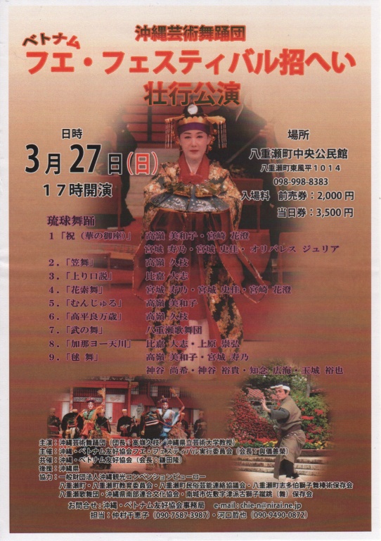 ベトナム中部都市フェにて行われる、国際フェスティバルに日本からは沖縄が招聘されました。このフェスティバルに参加をすべく、この度壮行公演を行います。フェスティバルは4月行われます。