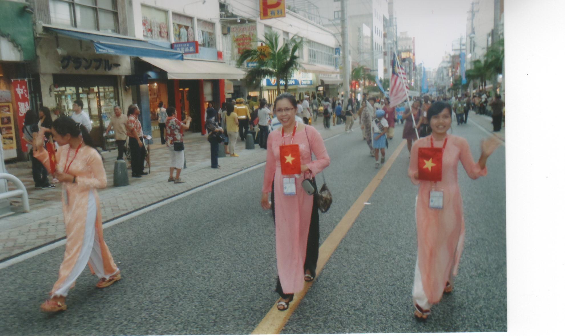 13日の国際通りパレードには、来沖中のミーチャウ・フェ省外交部副部長と沖縄研修中のビエンさんとヒエンさん、それに、近い将来フェ省に空手道場を造って空手を普及させる目標をもっている協会会員の仲村幸雄さん、会長、副会長が参加し、2万余りのメンイストリートの両側を埋める観客にベトナムをアピールした。