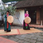 ベトナム民族衣装に雨や日よけの傘を持ち農村の民謡を歌う。ベトナムではこのような出張出演するプロダクションがあります。