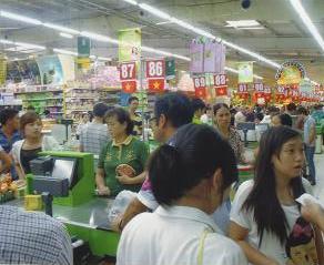1階がブランドショップで、長いエスカレーターで2階に上がるとスーパーマーケットになっている。売り場面積10,000㎡、レジが100台並ぶ大型店舗であり、食糧品、衣料品、薬品、電気製品などの外、ベトナム人の生活必需品のバイクなども販売し、炊事用品の説明販売もあった。買い物客は出口でガードマンにレシートをチェックされて、何かものものしかった。(写真10)
