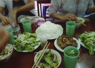 昼食はハノイ名物ブンチャを味わう。ベトナムと言えばフオーという米粉のうどんで有名であるが、北と南でも麺にはいろいろある。ブンという米麺を甘酸っぱいタレにつけて食する。店にはいると、タレとともに、盛り付けの揚げ春巻き、炙った肉、ツクネ、香草が出てきた。また大皿山盛りの麺が出てきてびっくりしたが、案外さっぱりした味でいくらでも入る。筆者としては、ベトナム料理の中でベストスリーに推薦したい程美味く、再来・再食したい店であった。(写真11・12)