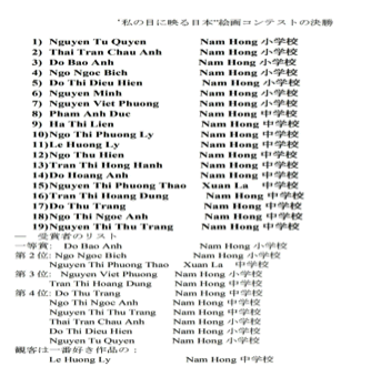 そのうちの①②④は、「日本文化フエステバル」と題して、日本文化・日本語に興味をもつ日本人を対象とし、③の絵画展「私の目に映る日本」は、ドンアイン・ソクソン地区の小中学生、6~15歳を対象に、10月20日までに、日本・日本人について描いた水彩画や油絵を募集し、20点を選びコンテスト会場に展示した(1・2・3位、各1名、奨励賞5名、人気投票賞1名)。